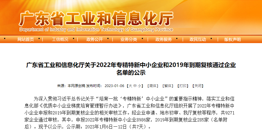近期,廣東省工業(yè)和信息化廳公示了2022年專精特新中小企業(yè)的認(rèn)定名單,金年会jinnian光電位于其中。
